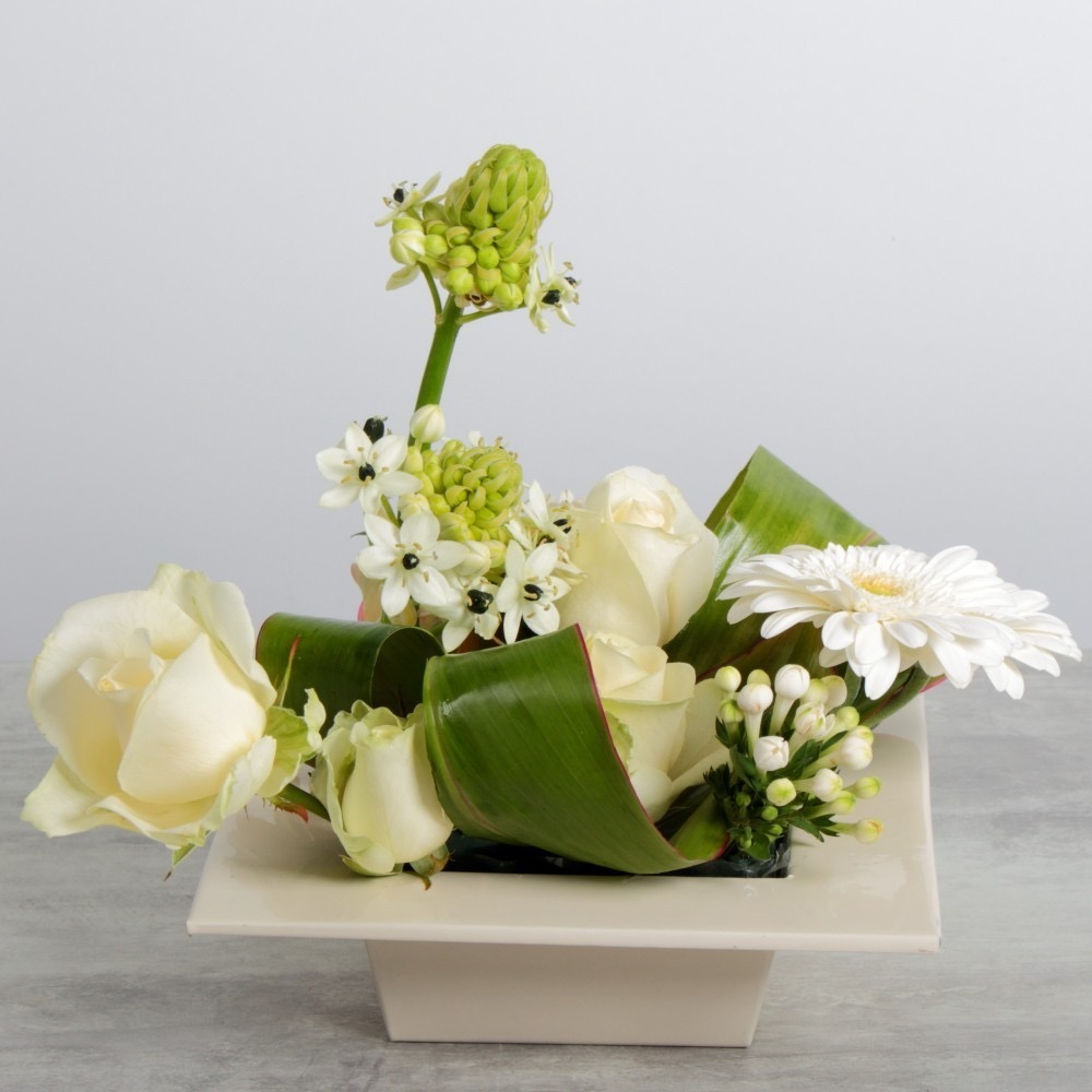 Roses blanches et ornitogalum arabica dans une base carré ivoire