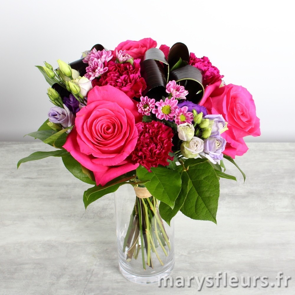Bouquet serré de fleurs framboises et violettes avec cordyline roulée