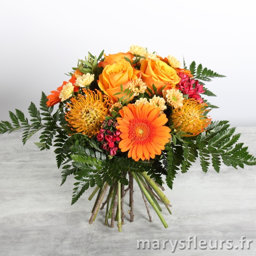 Fleurs exotiques et traditionnelles se marient dans ce bouquet