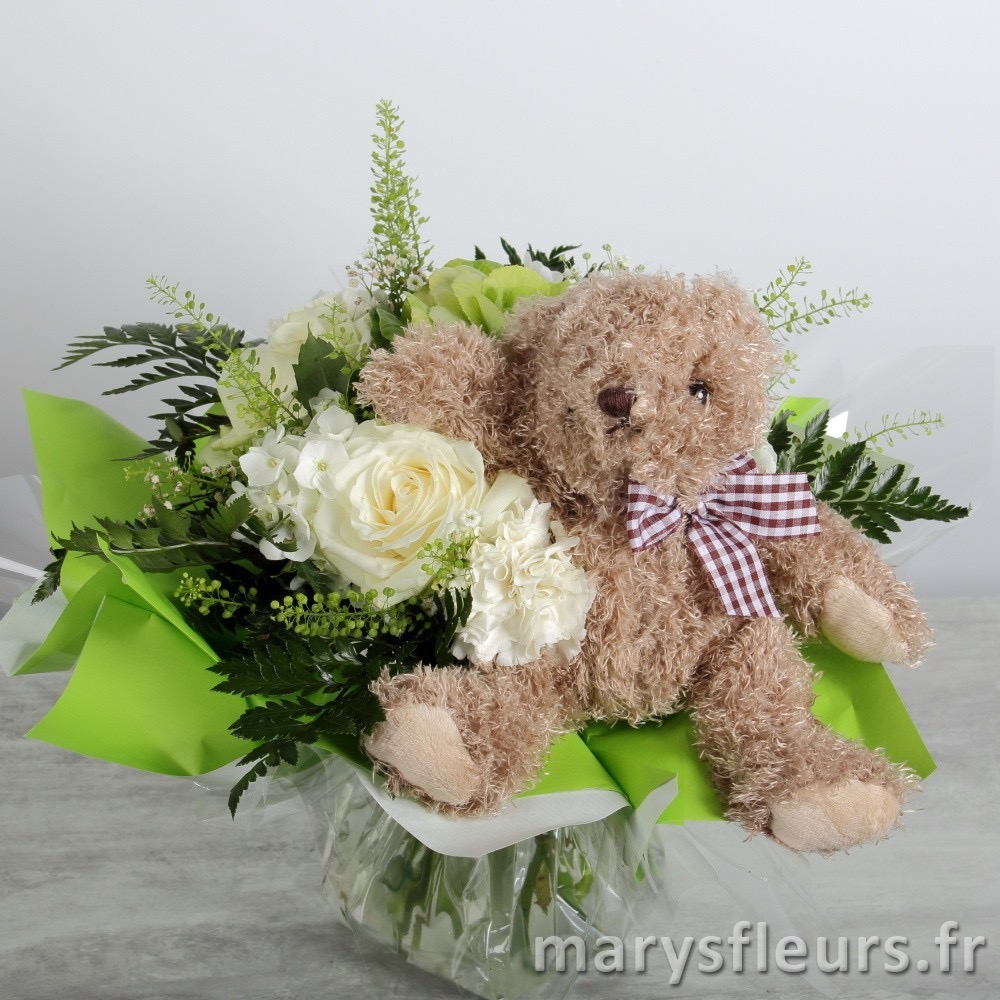 Offrez son premier doudou au nouveau-né et un joli bouquet à la Maman
