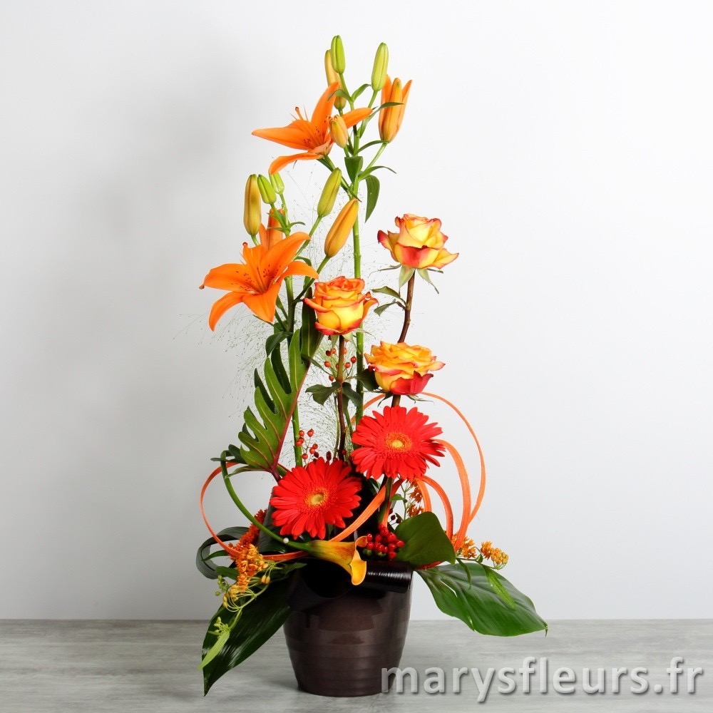 Composition aérienne de gerberas, roses et lys, avec un travail de lignes