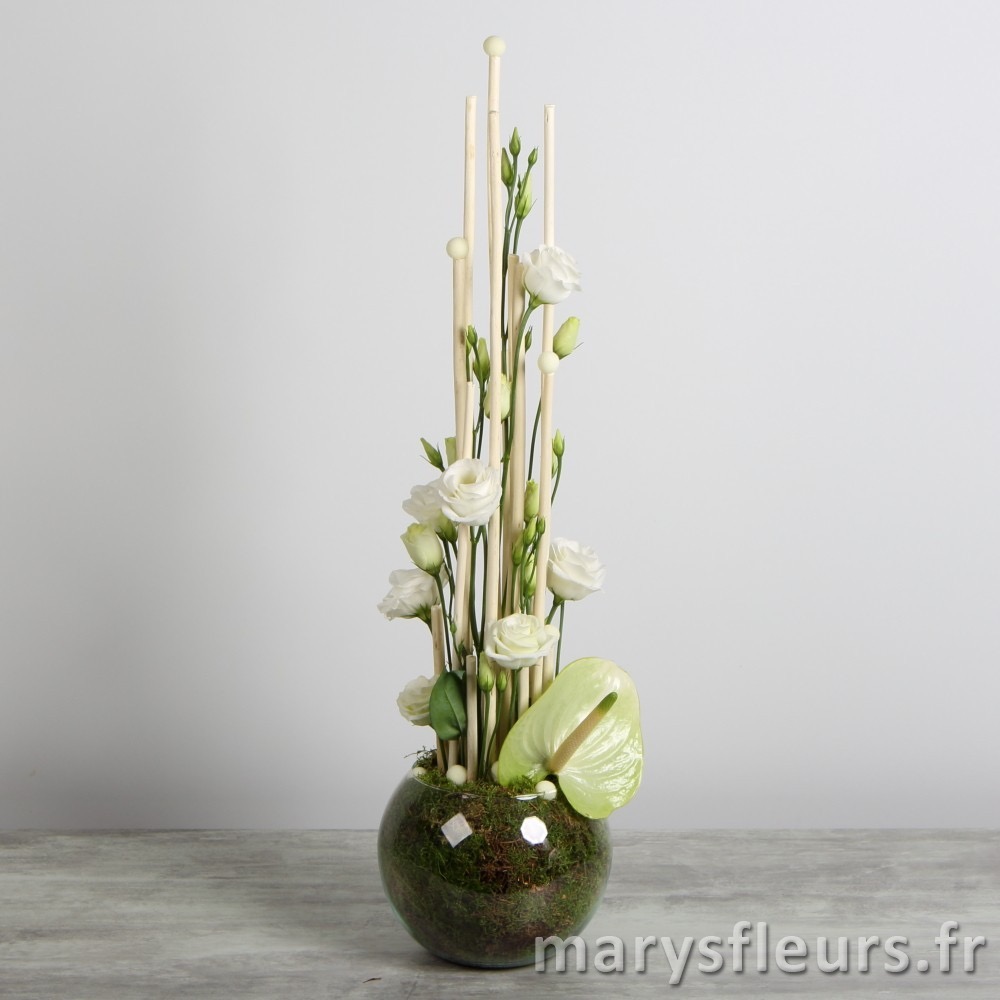 Verrerie remplie de mousse naturelle et volcan de lysianthus
