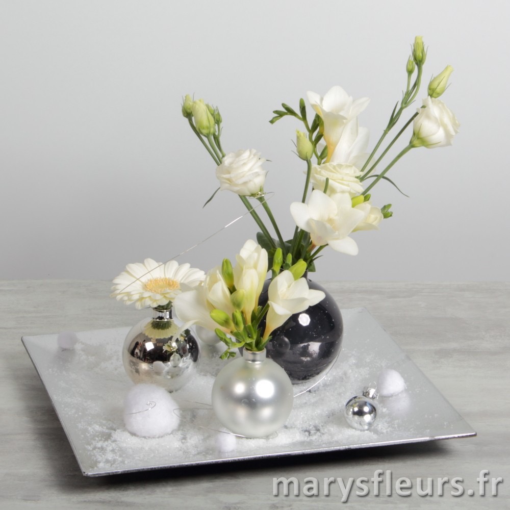 Ce plateau argenté arrive tout droit du grand nord avec ses boules de neige et de Noël. Fleurs blanches variées ornent ce joli centre de table.