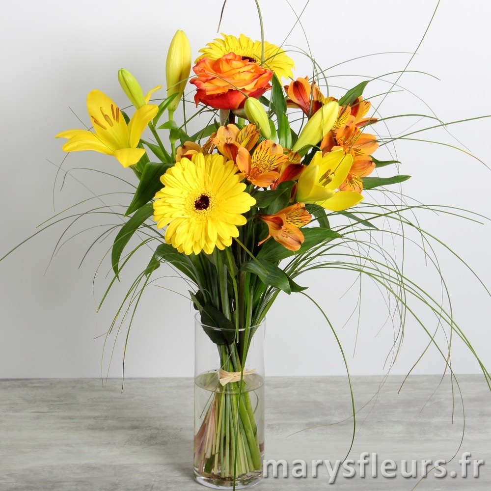 Bouquet flou grâce à sa base de beargrass, agrémenté de lys jaune, gerberas, alstromerias et une rose