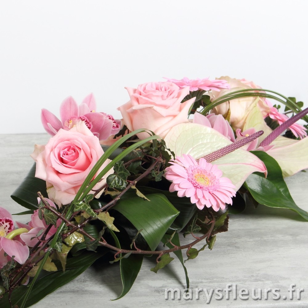 Centre de table rose composé de roses, germinis, cymbidium et anthurium