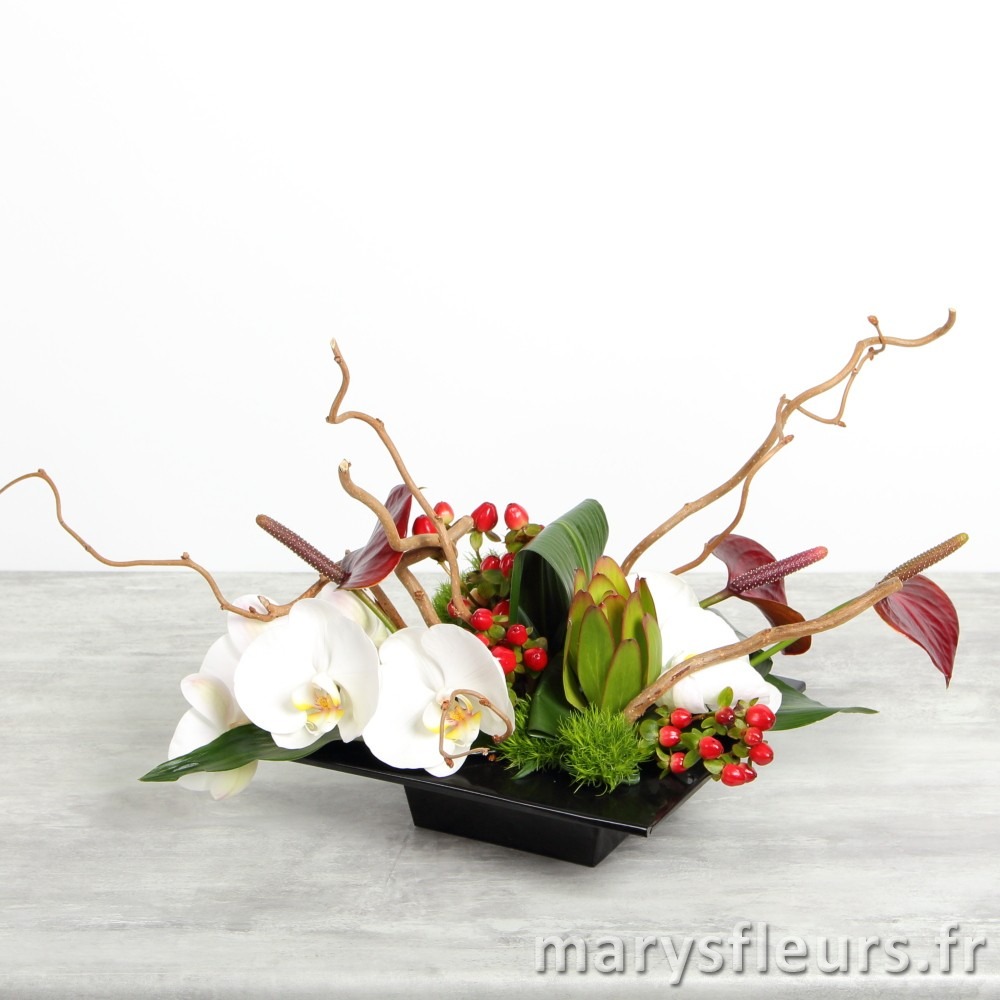 Centre de table composé de fleurons d'orchidées blancs et d'anthuriums.