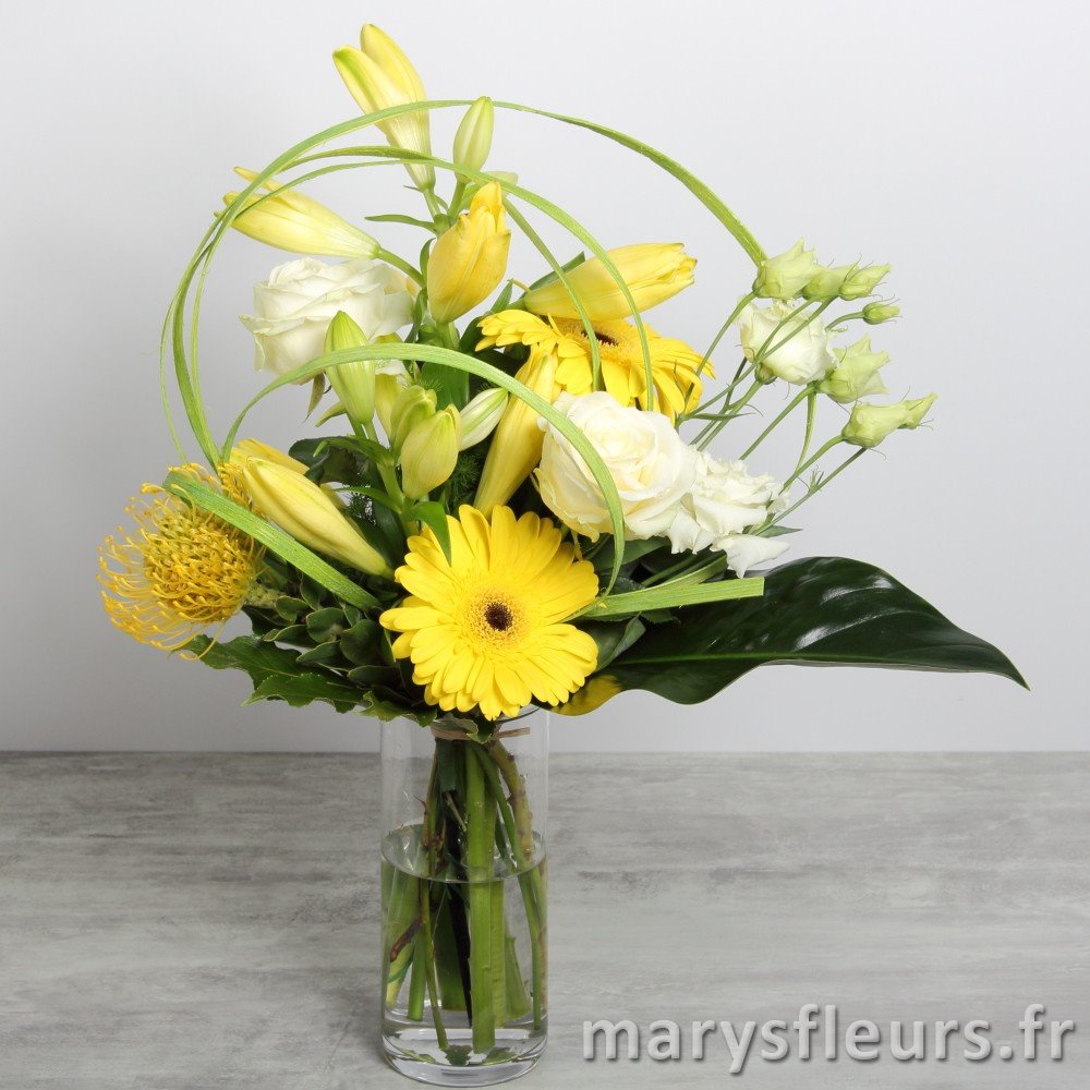 Bouquet composé de roses, lys, gerberas et exotique dans une dominante de jaune