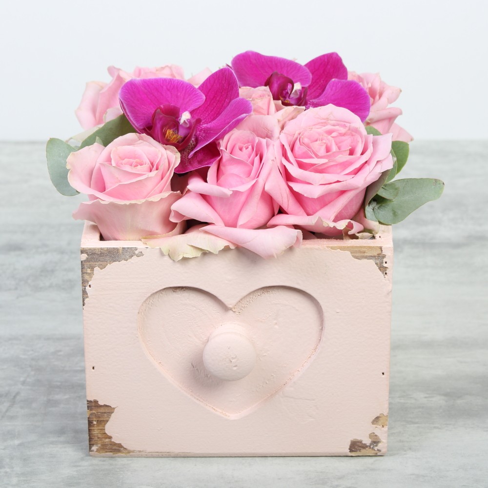 Composition de roses roses poudrées dans un jolie contenant tiroir en bois, agrémenté d'orchidées