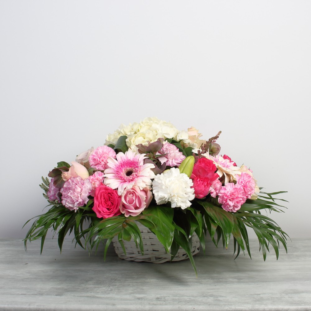 Panier composé de belles fleurs de saison dans des teintes roses et blanches. Une douce composition qui accompagnera avec tendresse vos messages de condoléances.