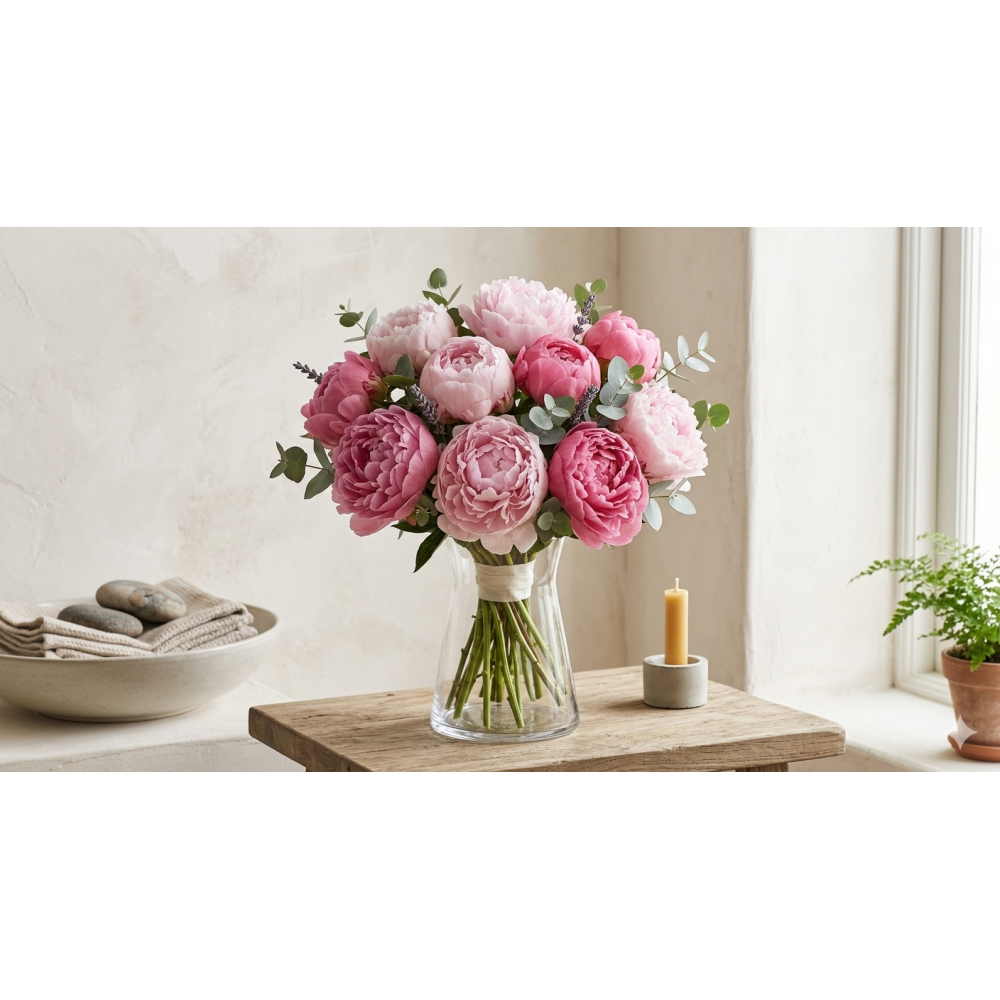 Succombez au charme de ce bouquet de pivoines, composé de fleurs fraîches aux pétales généreux et au parfum délicat. Symbole de romantisme et d’élégance, la pivoine apporte douceur et raffinement à toutes les occasions.